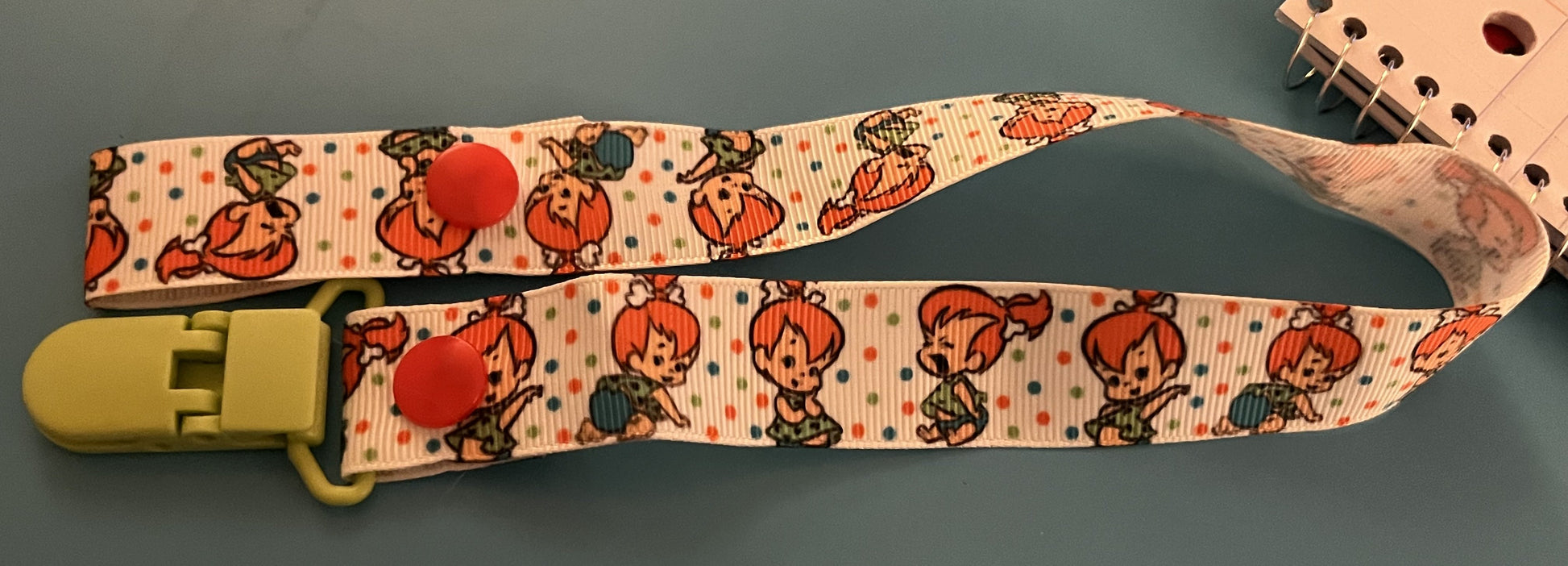 This is a pacifier clip made from grosgrain ribbon. It's got a pattern of Pebbles Flintstone. If you want the clip and/or snaps a certain color, please tell me, as they are usually chosen at random.