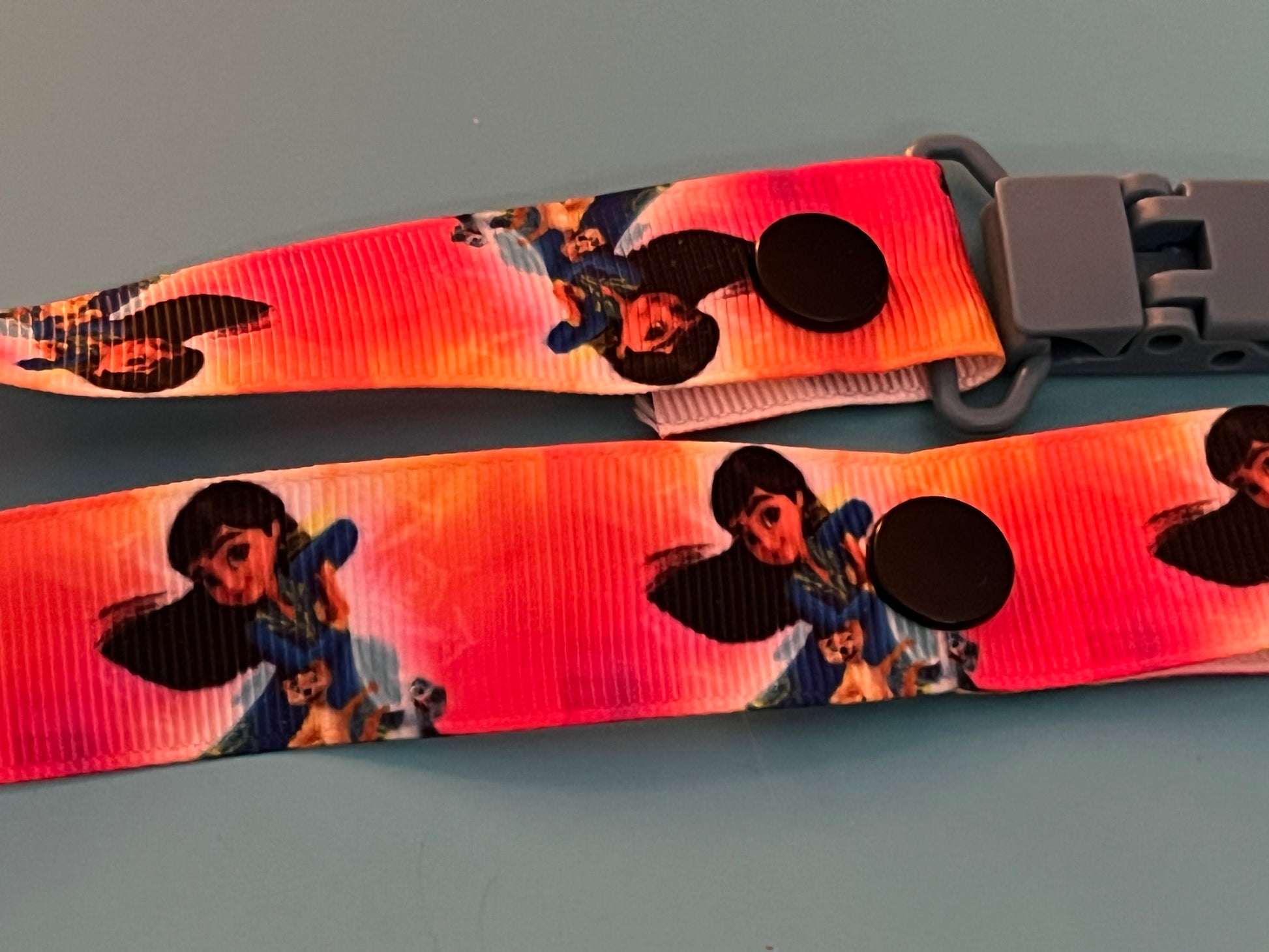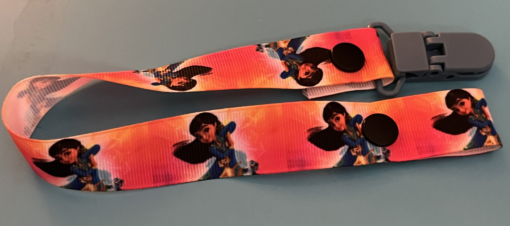 This is a pacifier clip made from grosgrain ribbon. It has a pattern of Mira from Mira; Royal Detective. If you want the clip and/or snaps a certain color, please tell me, as they are usually chosen at random.