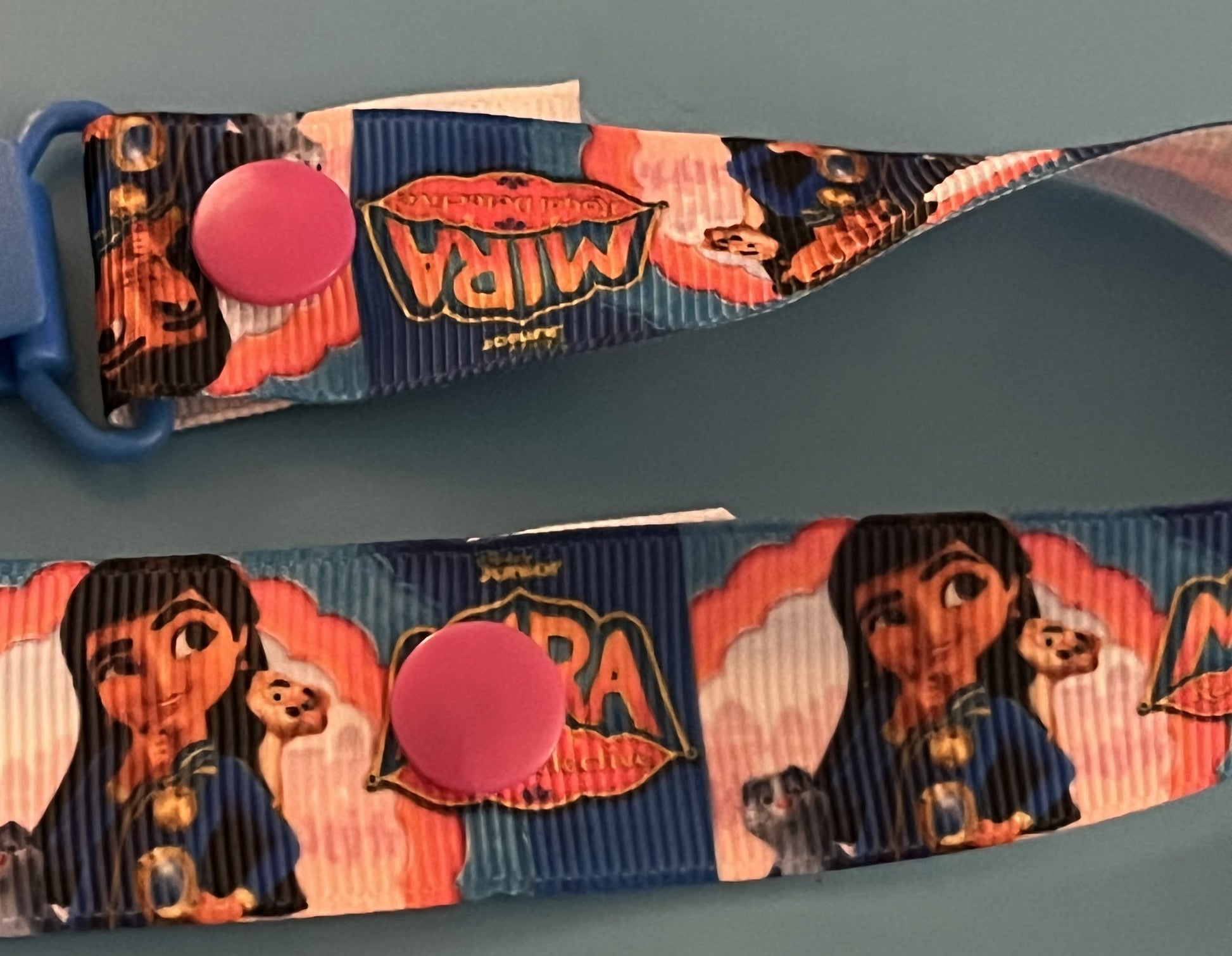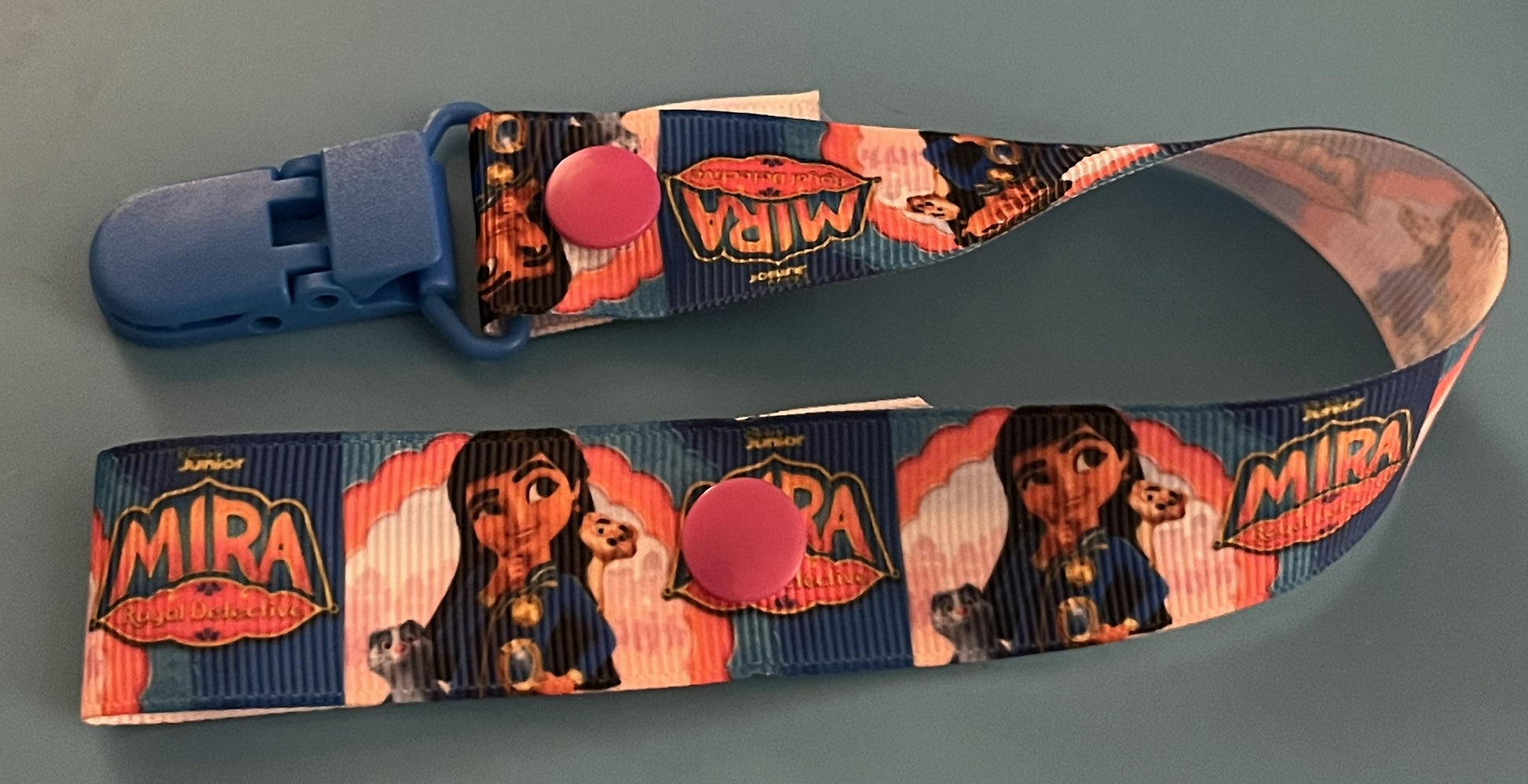 This is a pacifier clip made from grosgrain ribbon. It has a pattern of Mira from Mira: Royal Detective. If you want the clip and/or snaps a certain color, please tell me, as they are usually chosen at random.