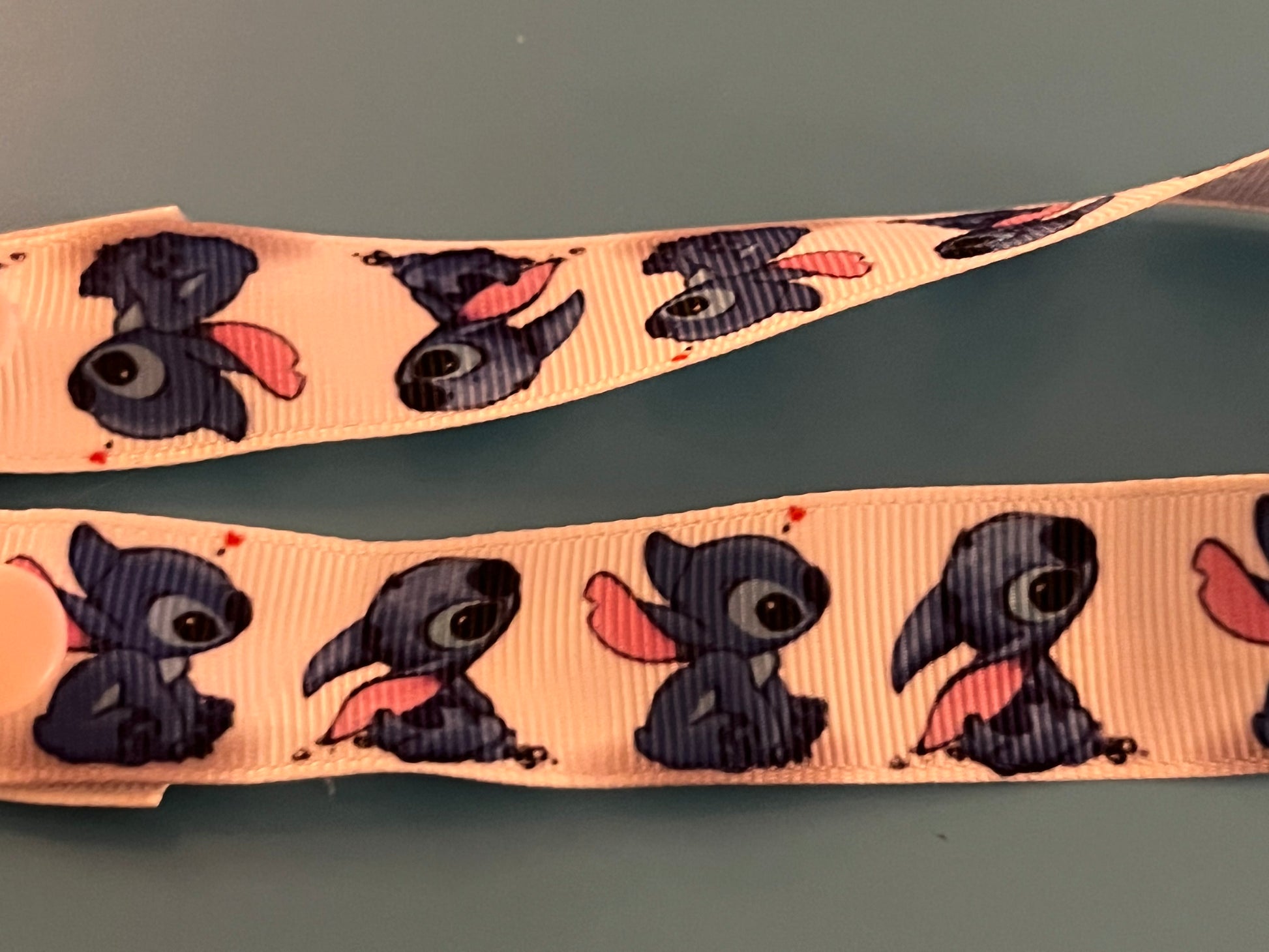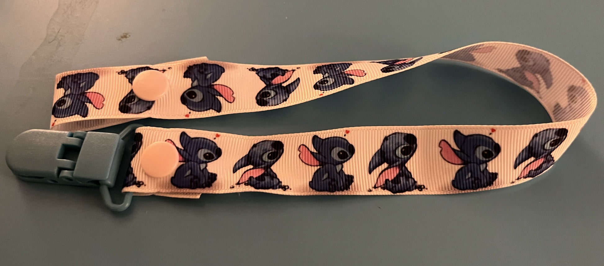 This is a pacifier clip made from grosgrain ribbon. It has a pattern of Stitch sitting down. If you want the clip and/or snaps a certain color, please tell me, as they are usually chosen at random.