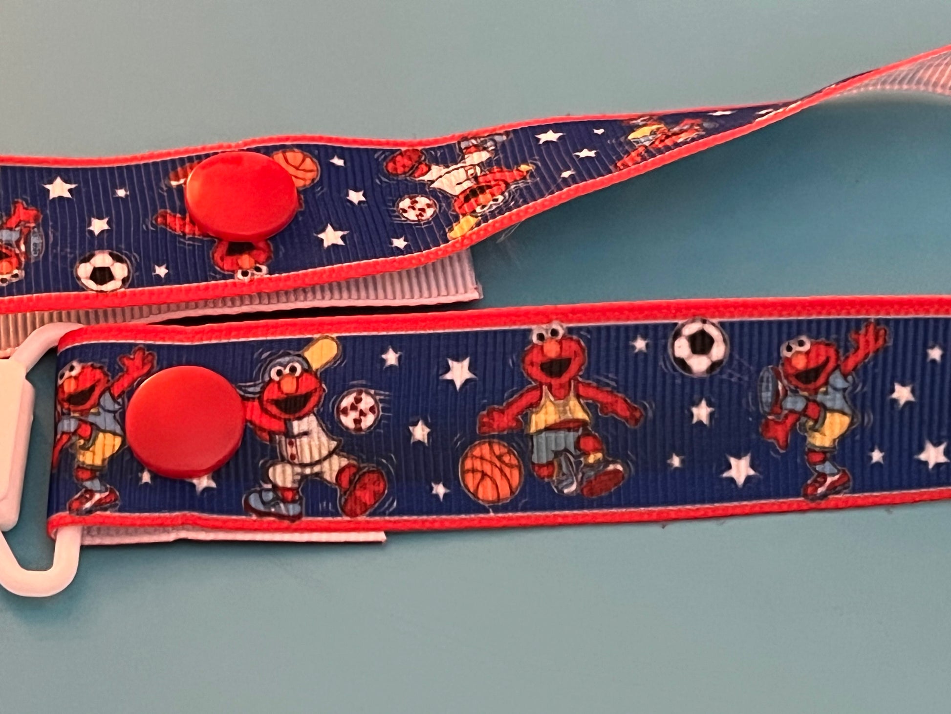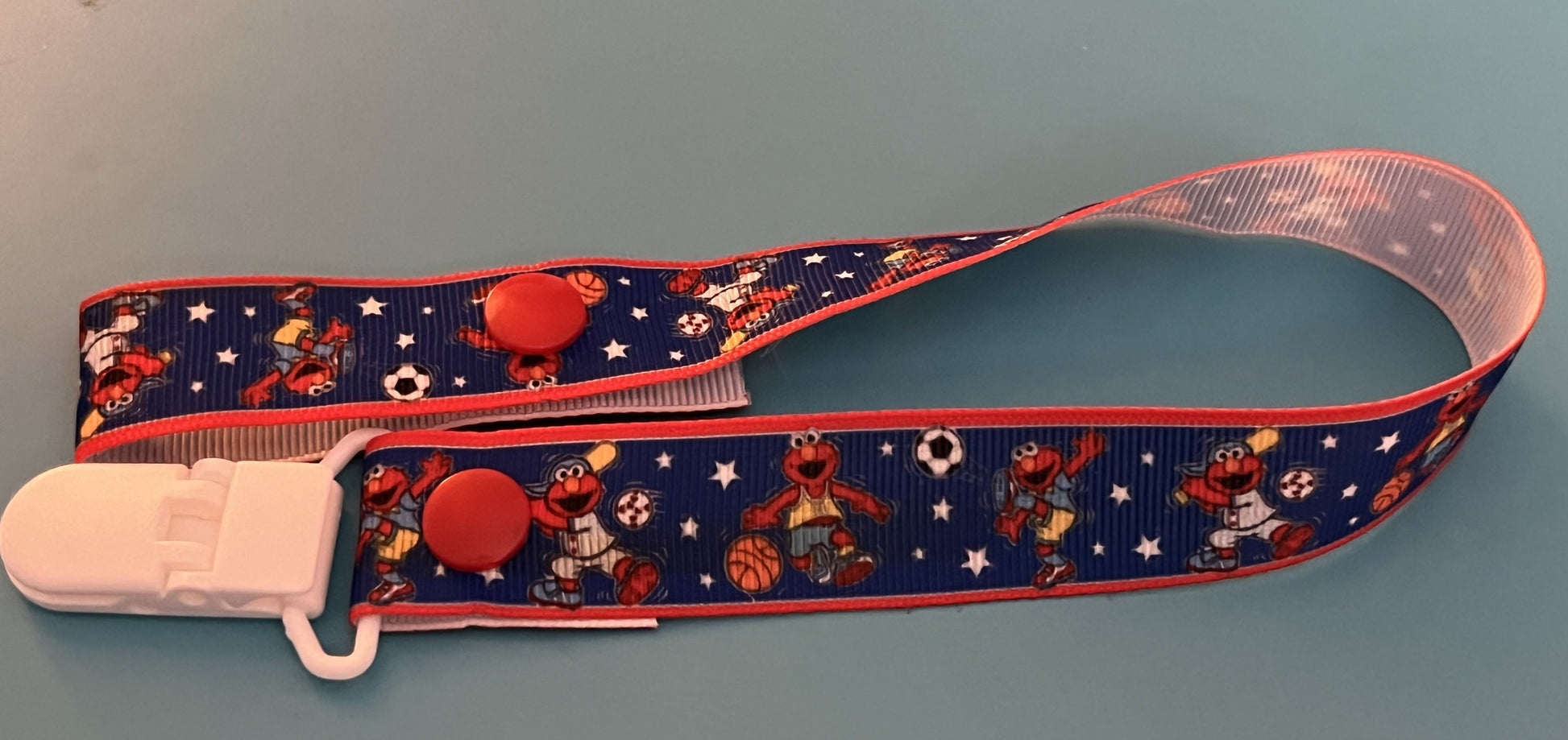 This is a pacifier clip made from grosgrain ribbon. It has a pattern of Elmo playing sports. If you want the clip and/or snaps a certain color, please tell me, as they are usually chosen at random.