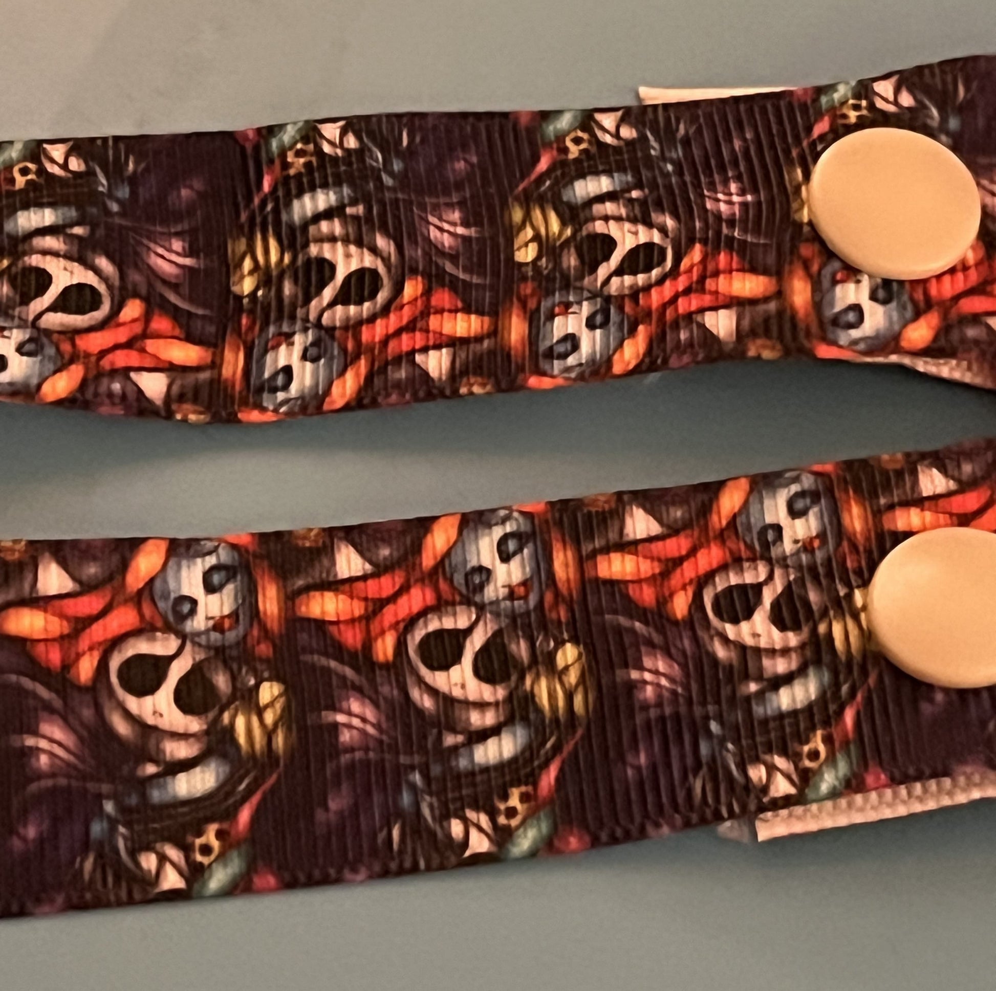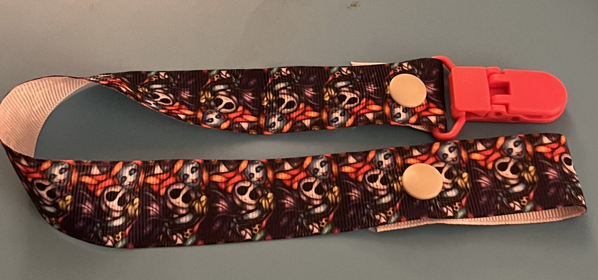 This is a pacifier clip made grosgrain ribbon. It has a pattern of Jack & Sally from The Nightmare Before Christmas. If you want the clip and/or snaps a certain color, please tell me, as they are usually chosen at random.