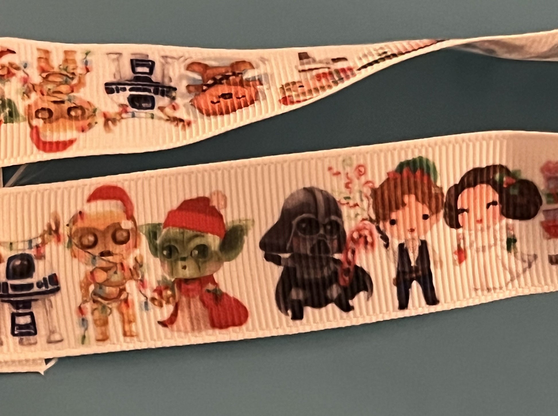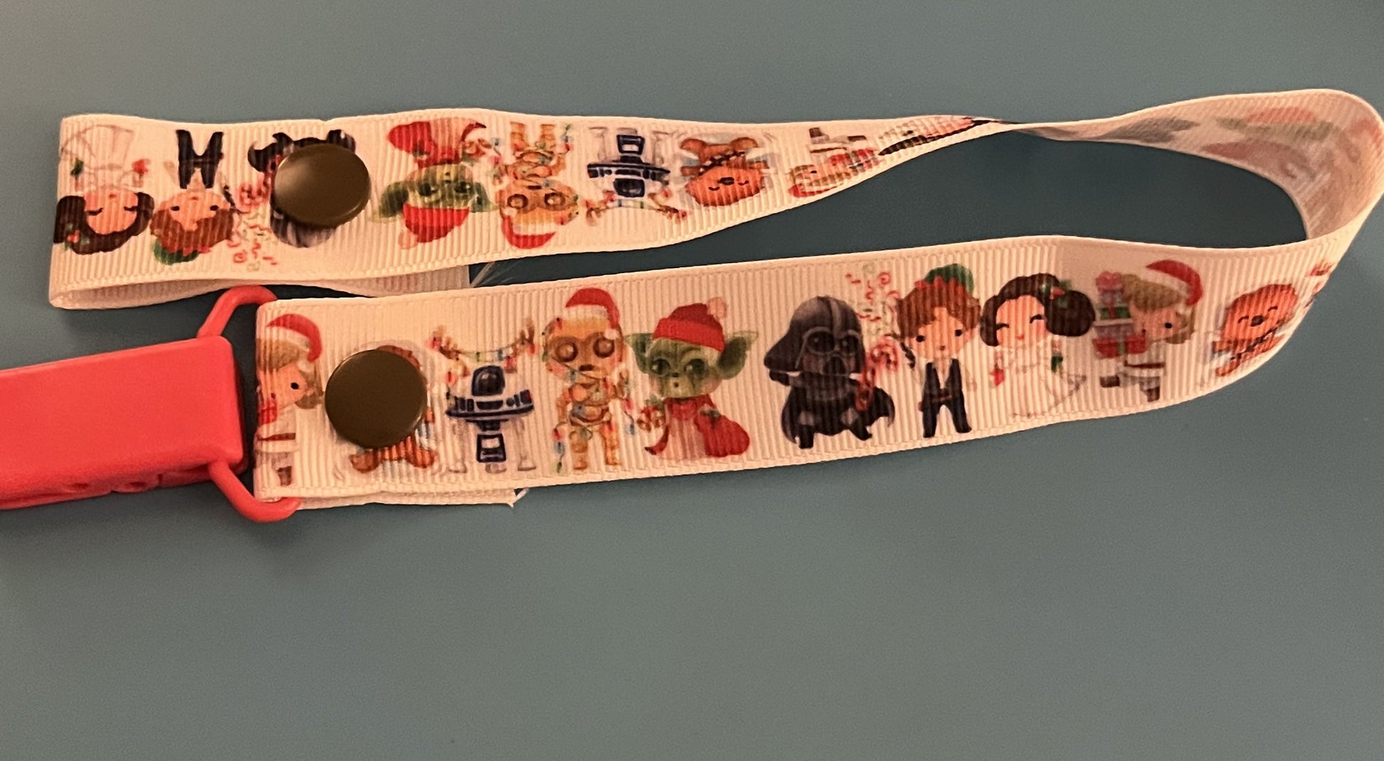 This is a pacifier clip made from grosgrain ribbon. It has a pattern of Christmas-themed Star Wars characters. The characters included here are Luke Skywalker, Princess Leia, Han Solo, Chewy, Yoda, CP3O and R2D2. If you want the clip and/or snaps a certain color, please tell me, as they are usually chosen at random.