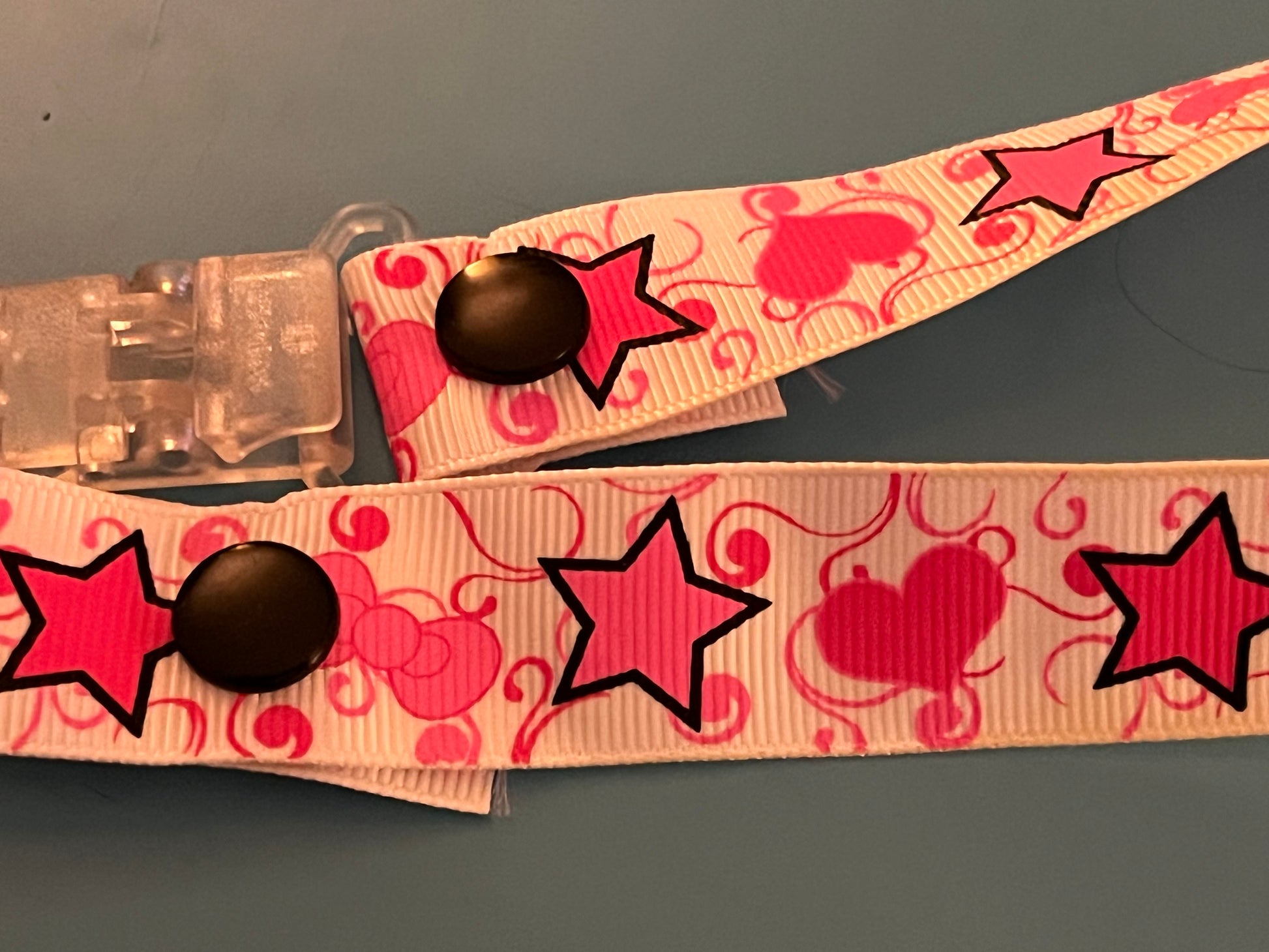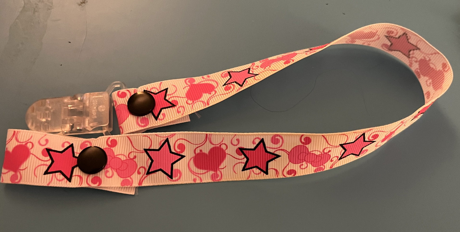 This is a pacifier clip made from grosgrain ribbon. It has a pattern of hearts, stars, and bows. If you want the clip and/or snaps a certain color, please tell me, as they are usually chosen at random.