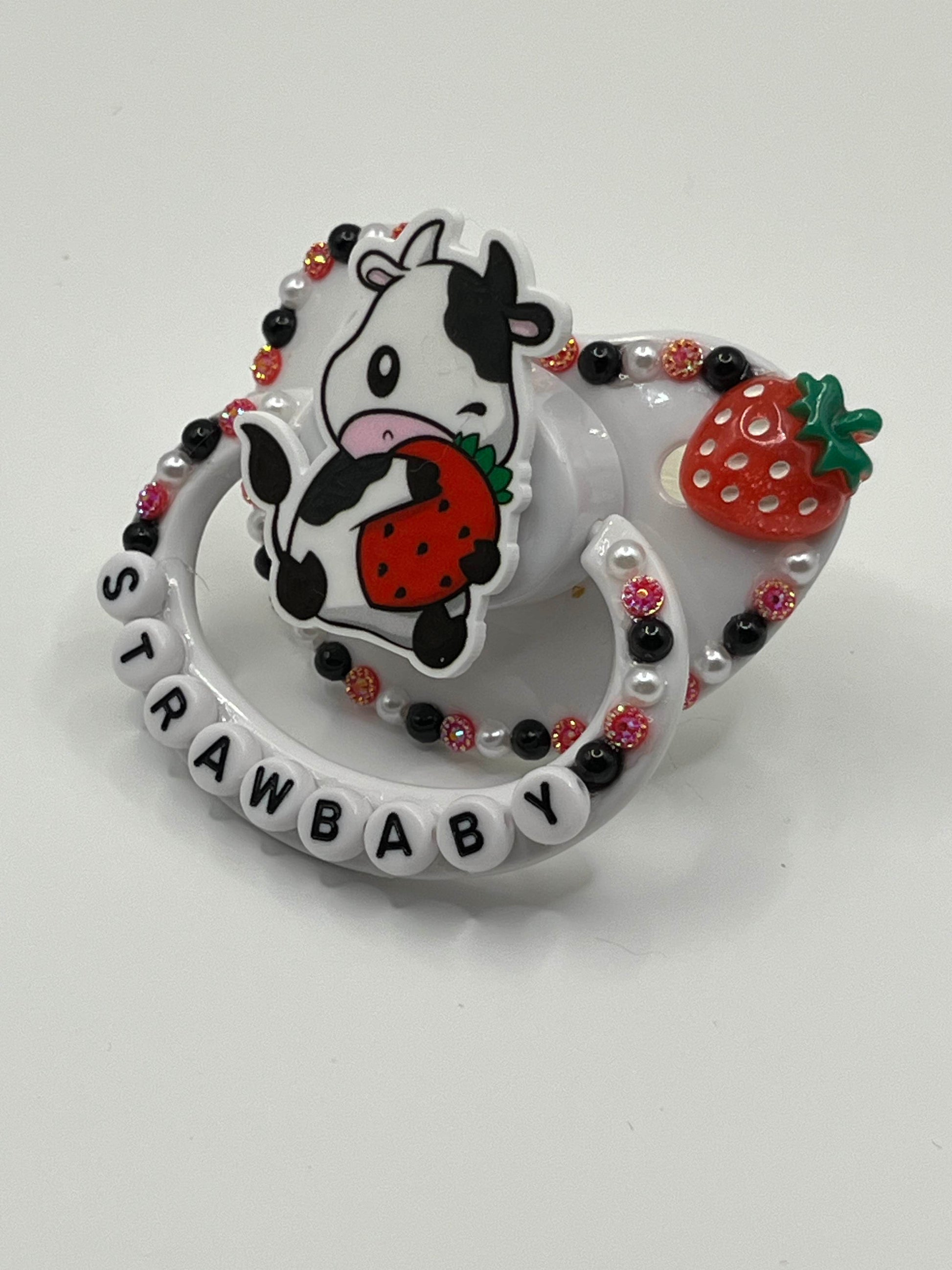 This is a white adult pacifier with a cow center. There's a strawberry in the right-hand corner of the shield,a nd it's outlined in black and white pearls and red sunflower rhinestones. "Strawbaby" is written on the handle in black and white alpha beads.