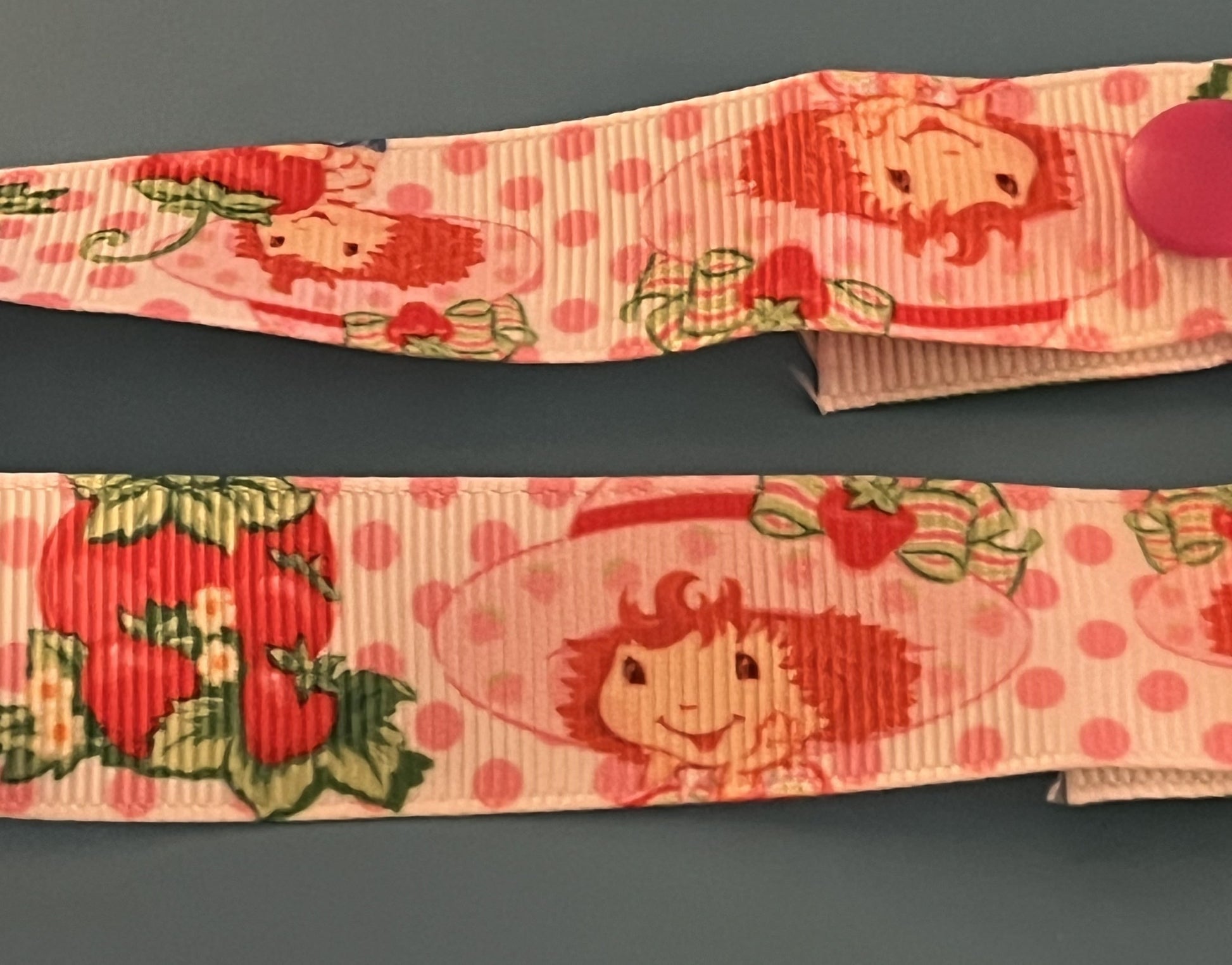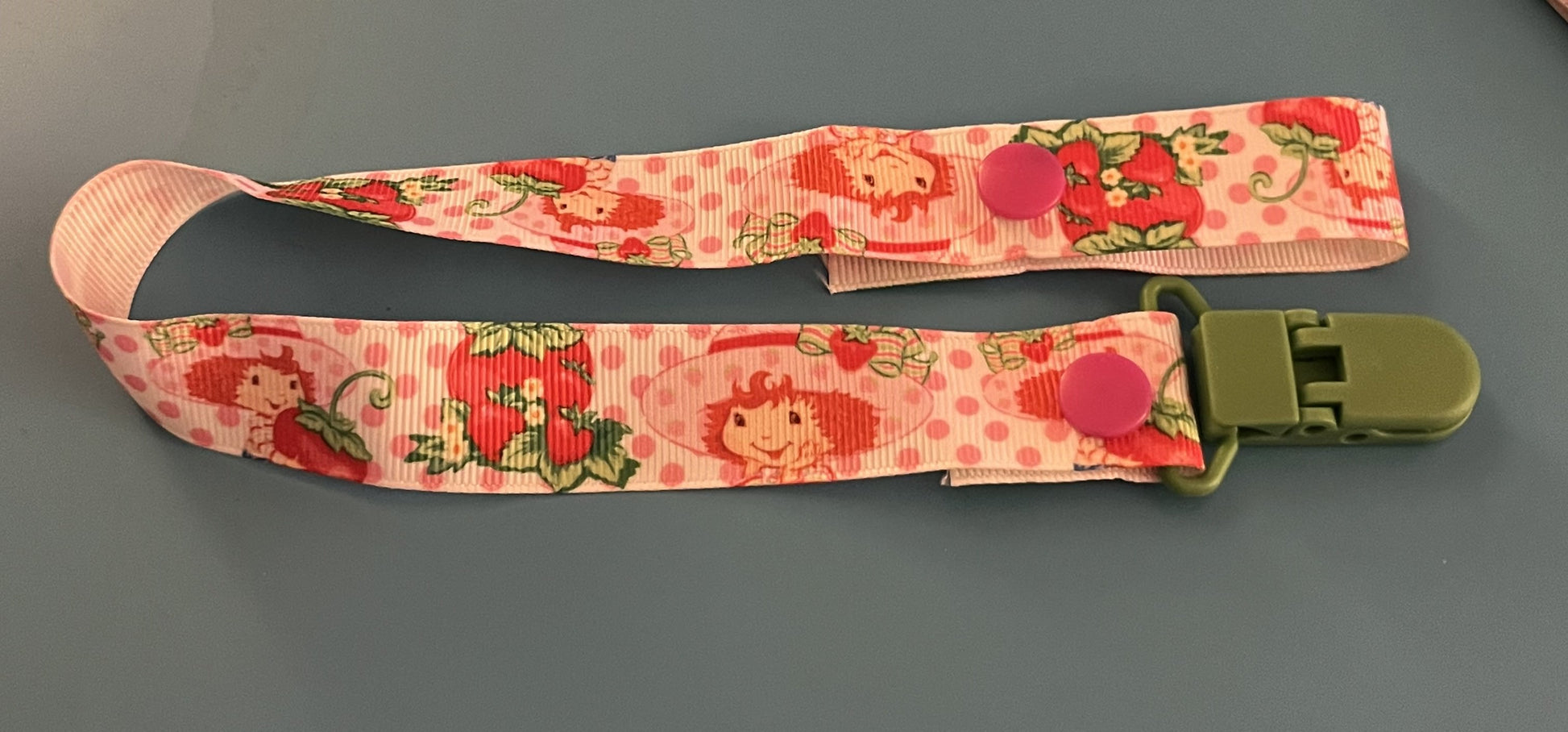 This is a pacifier clip made from grosgrain ribbon. It has a Strawberry Shortcake pattern. If you want the clip and/or snaps a certain color, please tell me, as they are usually chosen at random.