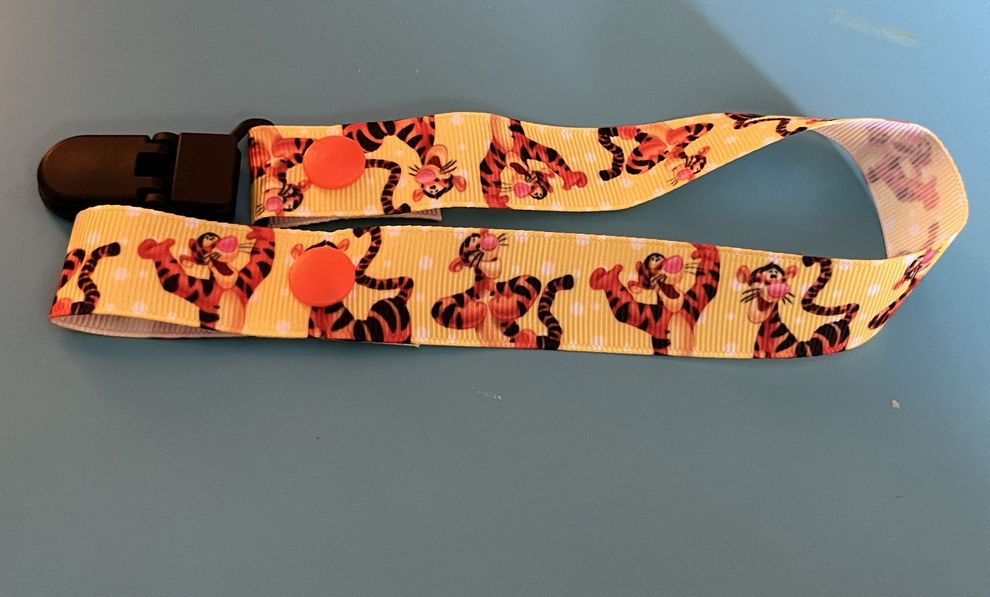 This is a pacifier clip made from grosgrain ribbon. It has a pattern of Tigger. If you want the clip and/or snaps a certain color, please tell me, as they are usually chosen at random.