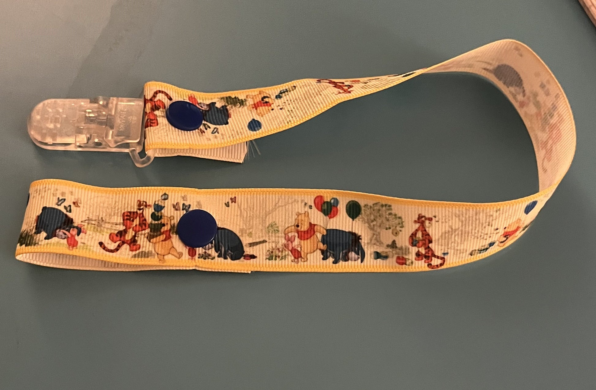 This is a pacifier clip made from grosgrain ribbon. It has a pattern of the Winnie the Pooh gang. If you want the clip and/or snaps a certain color, please tell me, as they are usually chosen at random.