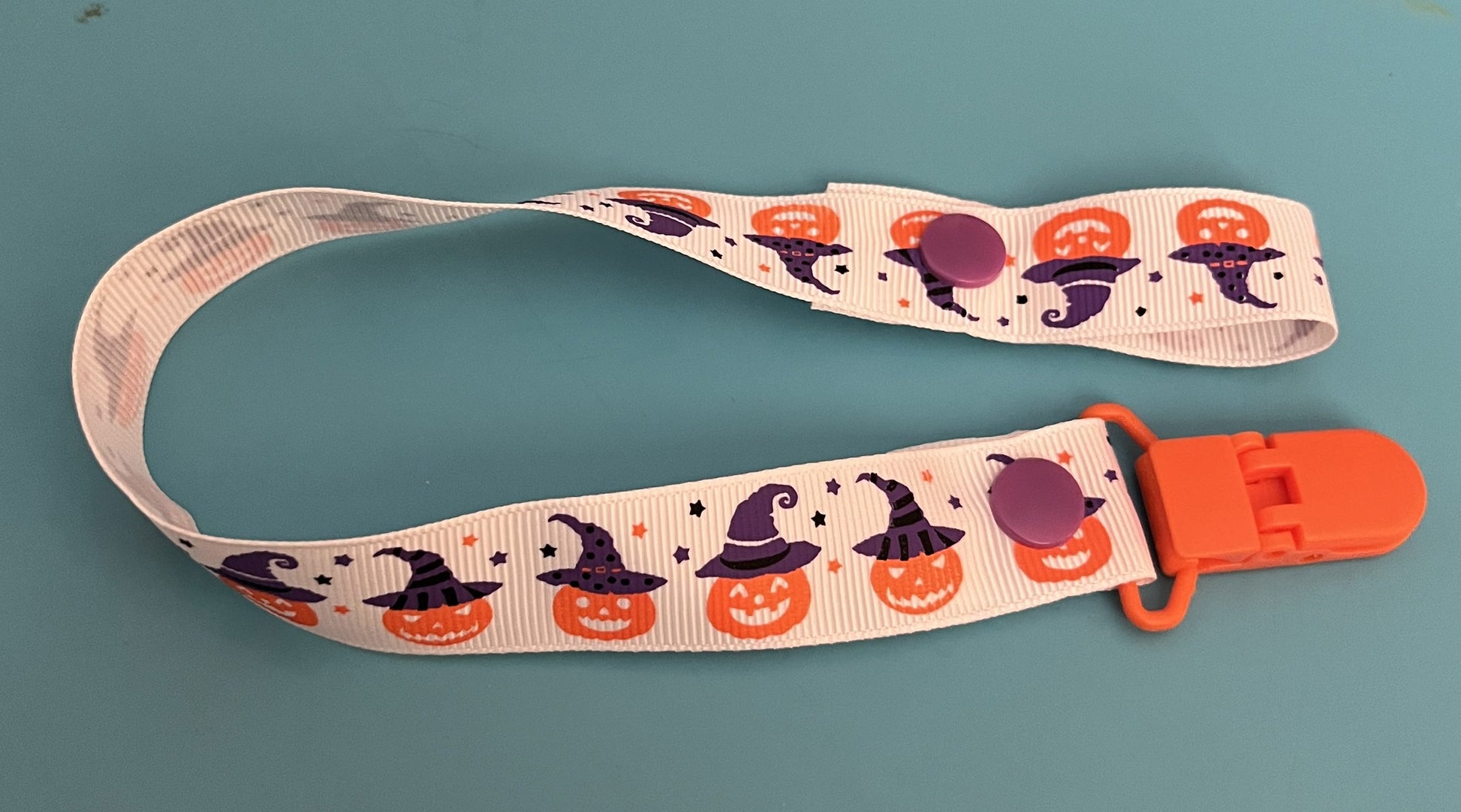 This is a pacifier clip made from grosgrain ribbon. It has a pattern of jack o'laterns. If you want the clip and/or snaps a certain color, please tell me, as they are usually chosen at random.