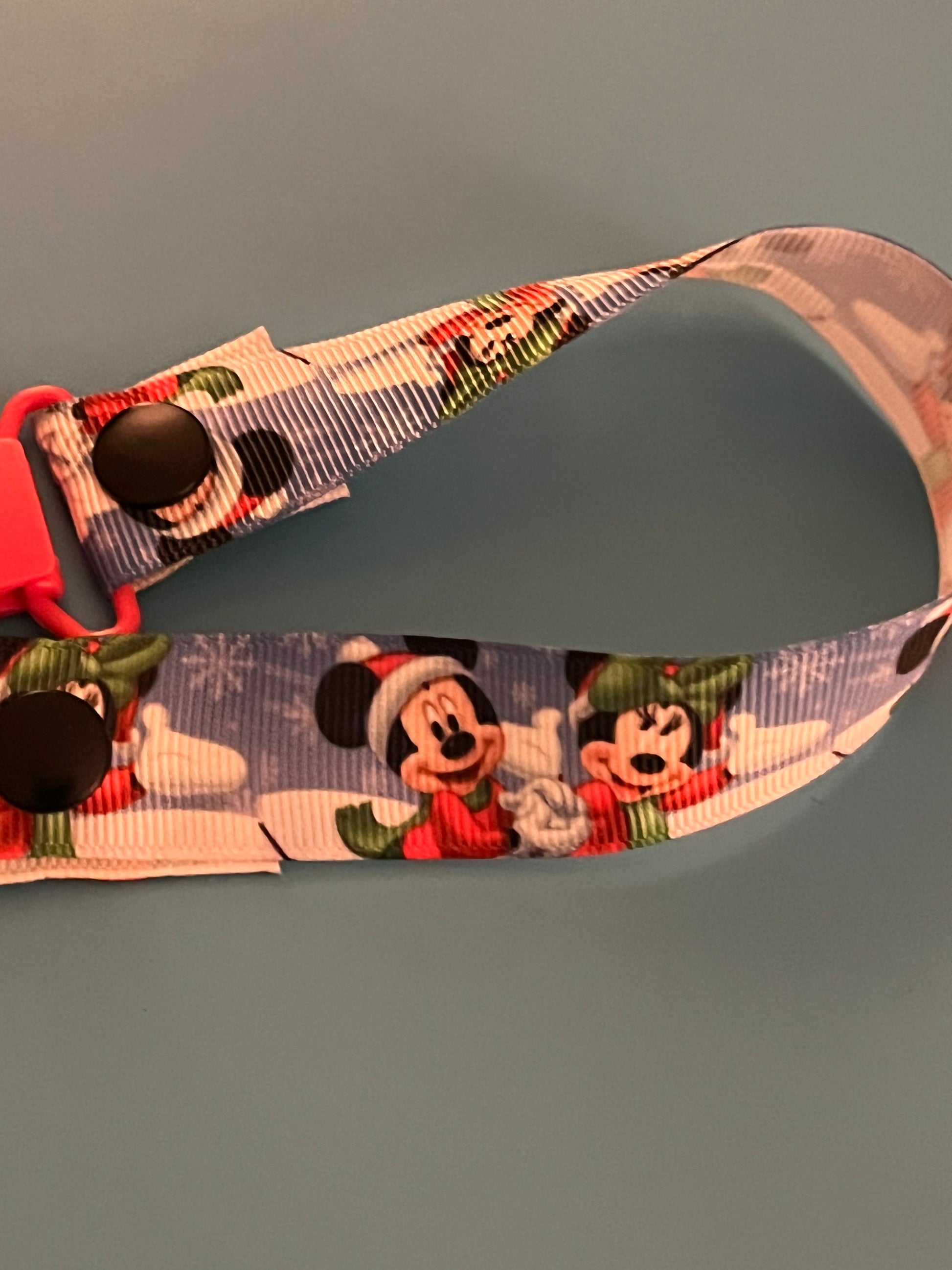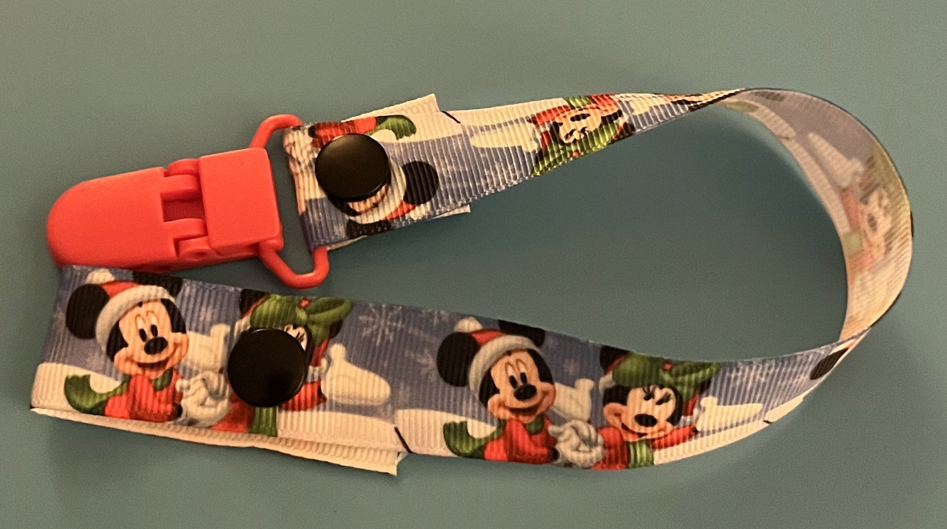 This is a pacifier clip made from grosgrain ribbon. It has a pattern of Minnie and Mickey Mouse in the snow. If you want the clip and/or snaps a certain color, please tell me, as they are usually chosen at random.