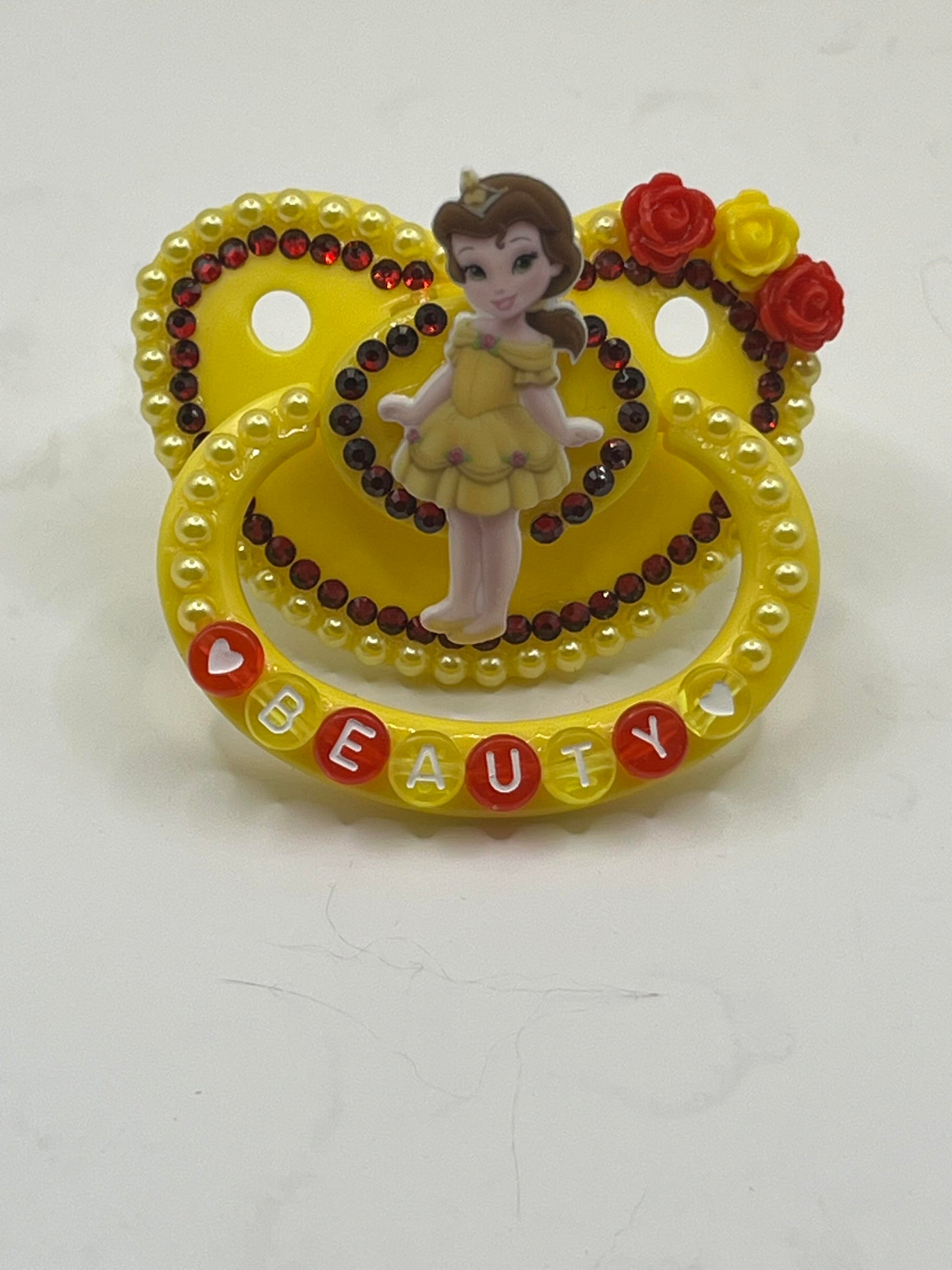 This is a yellow adult pacifier with a toddler princess center. There are 3 small roses on the right-hand corner of the shield. The pacifier is outlined in yellow pearls and then again in red rhinestones. "Beauty" is written on the handle in red and yellow alpha beads.